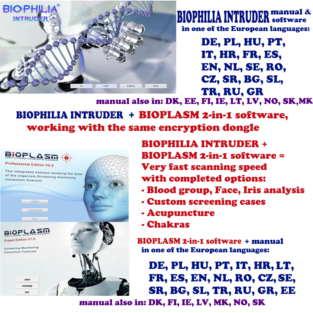 Software-ul Biophilia Intruder NLS permite scanarea a aproximativ 1500 organe, tesuturi, microorganisme, la nivel celular, cu cca 15000 etaloane spectrale digitizate.