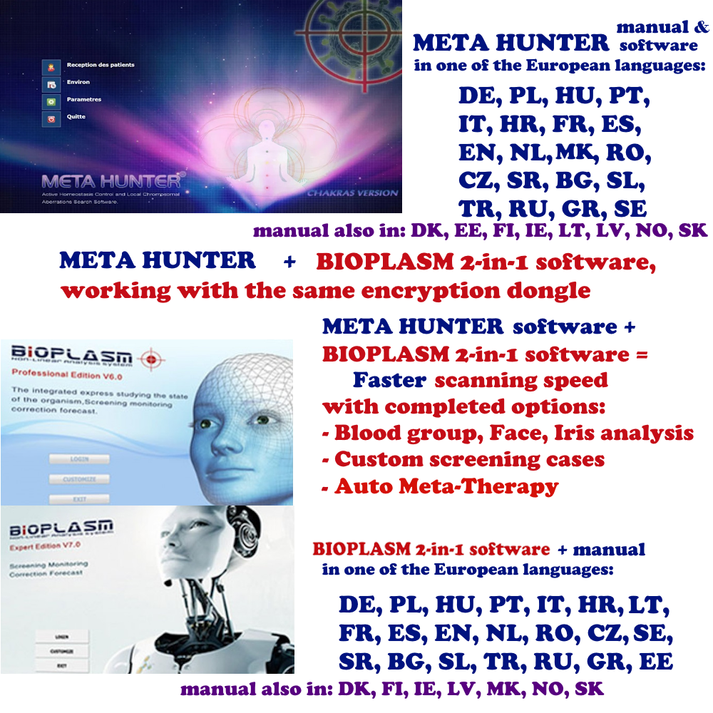 Softul Bioplasm 2 in 1 adauga optiunile: Grupe de sange, Analiza faciala si Iris, Auto Meta Terapie, Cazuri de scanare personalizate.